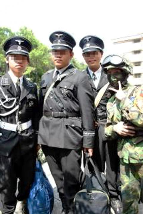 The photo, taken by the Ministry of National Defense’s Military News Agency, showed three students in World War II German Waffen SS uniforms with a person in a military camouflage uniform standing next to them doing a “V” sign. Beside them is also a member of the camp’s staff, who remained unidentified.