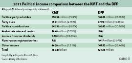 The figures, published on Thursday by the ministry, reveal that political contributions to the KMT amounted to NT$240 million, or 6.9 percent of its earnings. It also earned NT$251 million in vote subsidies and an income of NT$76 million from party dues.