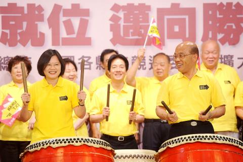 Tsai shared the podium with former premiers Su Tseng-chang (蘇貞昌), Frank Hsieh (謝長廷) and Yu Shyi-kun, all of whom are expected to play important roles in the campaign, as well as other prominent party members.