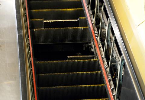 Kuo Cheng-chieh (郭政杰), 34, fell into the hole created by a 3m-long anti-flood board that hit the escalator at exit 1 of the station after he dropped it while trying to carry it up the escalator.