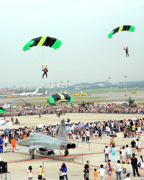 At the air show yesterday, the air force’s Thunder Tiger Aerobatics Team launched the show with an aerobatic performance, followed by a demonstration of parachuting techniques from the Airborne Brigade Skydiving Team. Jet fighters then soared through the air in formations and emitted colored smoke ribbons in the sky.