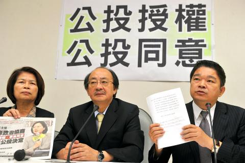 The caucus’ draft amendment proposes granting the Executive Yuan the authority to hold a referendum on negotiations between the Republic of China and the People’s Republic of China, DPP caucus convener Ker Chien-ming (柯建銘) told a press conference.