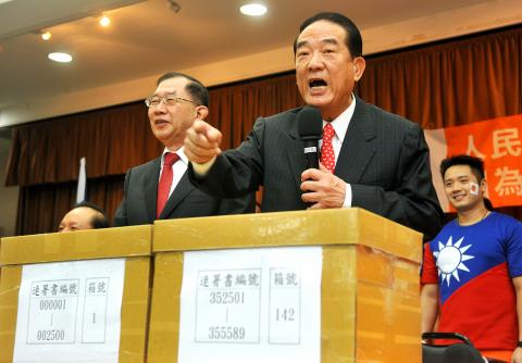 The PFP chairman said his aim was not to knock any candidate out of the race, although he said President Ma Ying-jeou (馬英九) had failed to revive the nation’s economy and reduce the unemployment rate.