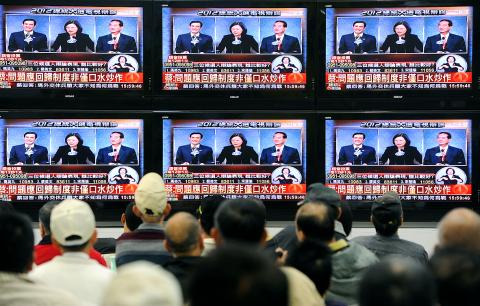 Ma: I am very glad that Mr Soong puts great emphasis on the establishment of information infrastructure. When I headed the Taipei City Government, I pushed ahead with the Wireless City project in the first four years and Broadband Wireless in the following four years. Now Taipei has become the city with the most widespread broadband wireless applications in Taiwan. Therefore, I have long hoped to turn “M Taipei” [Mobile Taipei Project] into “M Taiwan.” Of course, Chunghwa Telecom did reduce its fees a few times recently, but Internet users are still very dissatisfied. So on New Year’s Day this year, I brought up the “Centennial Vitality” project. It not only means protecting the environment, but also the Internet, hoping to increase its speed, with cheaper fees and more convenient usage. Not long ago, the Executive Yuan set up wireless Internet at 2,500 public sites of central government agencies. Since its inception in October, the results have been pretty good. We will continue to expand it. The competitive strength of the Internet has become a crucial part of the nation’s competitive strength. So on the one hand, we will continue this [policy] and on the other we call for high-resolution TV and digital convergence. There are, to be frank, some parts of China where progress [in those areas] is ahead of us. We have to rise and catch up. On this aspect, the DPP’s past efforts were actually very insufficient, so after we were in office, we did as much as we could, but because of various conditions, not everyone was satisfied with some parts. I am willing to review this part and accept Chairman Soong’s suggestion, to make further efforts, hoping all the infrastructure will be what I said at the beginning of the year — cheaper, faster and more convenient. Because the competitive strength of the Internet equals the competitive strength of the nation, I fully agree with you on this aspect, Chairman Soong and I hope Chairperson Tsai can join us. Let’s push for it together. The Internet has nothing to do with political stances.