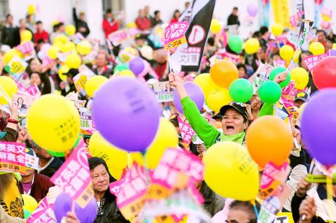 The DPP campaign received a boost of confidence from -enthusiastic support for Tsai’s motorcade, which traversed the DPP strongholds of Greater Tainan and Greater Kaohsiung. Campaign aides said turnout was solid, with 100,000 rally participants in Greater Tainan and 20,000 in Lujhu (路竹), Greater Kaohsiung, on Saturday; while yesterday 30,000 turned out in Fengyuan (豐原), Greater Taichung, and -Yuanlin (員林), Changhua County; and 150,000 in Taipei.