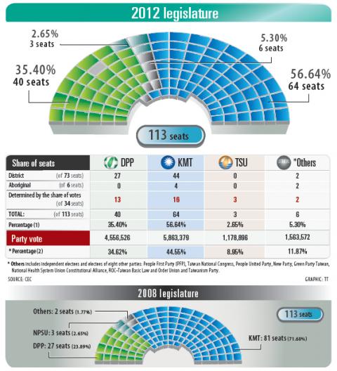 However, she added, the DPP did improve its standing in the legislature after a humiliating loss in the last legislative elections in 2008, when it won only 27 of the 113 seats against the KMT’s 81.