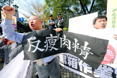 “We have three demands. First, as the issue is a public health matter, there is no room for compromise with the US. Second, the council has to open all of its meeting records for public inspection. Third, the committee should be reshuffled,” Homemakers’ Union and Foundation chairperson Chen Man-li (陳曼麗) said.
