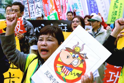 About 70 members from the groups rallied in front of the Control Yuan before marching to the Executive Yuan, where they demanded Chen’s resignation over what they described as the government’s “hasty” decision to lift the ban on US beef containing residues of the leanness-enhancing drug ractopamine.