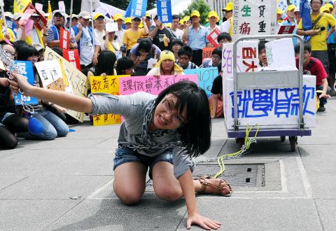 Near the end of the rally, the activists pasted pieces of paper that read “poverty,” “exhaustion,” “blind,” “debt” and other characters on a large board decorated with a printout of President Ma Ying-jeou’s (馬英九) Facebook page.