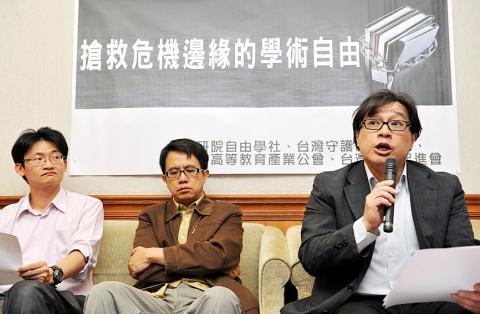 “It’s a positive thing for academics to be concerned about public issues and make comments about them,” Academia Sinica’s Institute of Sociology research fellow Lin Thung-hong (林宗弘) told a news conference at the Legislative Yuan. “It’s regrettable that politicians are trying to curb academics’ freedom to speak on public issues.”