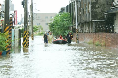 By 7pm, the bureau’s observation station at the Matsu Temple in Gueiren had received 271.5mm, the highest in the country. This was followed by Ciding Borough (崎頂) in Longci District (龍崎), Shalun Borough (沙崙) in Gueiren, Yongkang Borough in Yongkang District and Hutoupi (虎頭埤) in Sinhua District (新化), with 252.5mm, 245.5mm, 228.5mm and 212mm respectively.