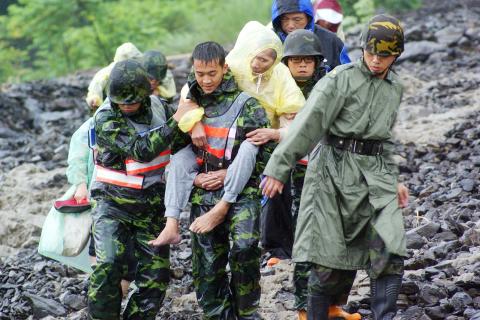 More than 300 troops have been dispatched to Greater Kaohsiung’s Jiasian (甲仙) and Liouguei (六龜) districts to help evacuate residents and assist with relief work.