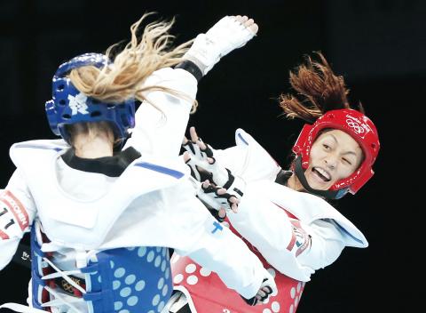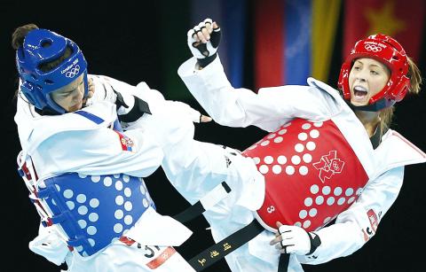 Jones went on to win Britain’s first Olympic taekwondo gold, beating China’s Hou Yuzhuo (侯玉琢) 6-4 in the final.