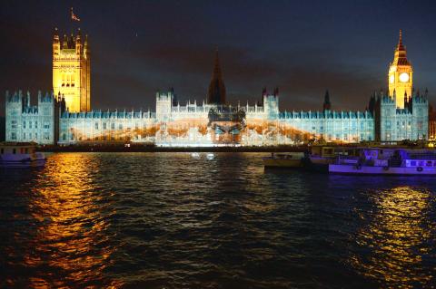 Monochrome recreations of London’s landmarks were covered in newsprint, from Big Ben’s clock tower and Tower Bridge to the London Eye ferris wheel and the chubby high-rise building known as the “Gherkin.”