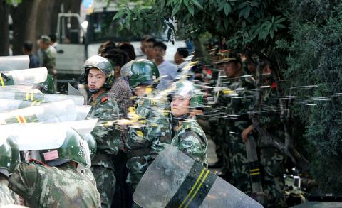 Japan’s leader said the dispute was affecting the safety of Japanese citizens in China. Rows of paramilitary police lined the perimeter of the embassy in Beijing as police let protesters in groups of up to 100 walk past the building. Many protesters threw items such as water bottles, bananas, tomatoes and eggs at the embassy and chanted that the disputed East China Sea islands, which are controlled by Japan, belong to China. Dozens carried portraits of former Chinese leader Mao Zedong (毛澤東), who is often used as a rallying symbol. One man draped the Japanese flag over his dog. Riot police stood on nearby streets and about 20 of their vehicles were parked behind the embassy.