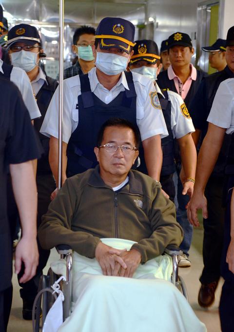 Former president Chen Shui-bian (陳水扁) was yesterday transferred to Taipei Veterans General Hospital (TVGH) from Taoyuan General Hospital for further check-ups and treatments. The transfer to the TVGH was met with objections by Chen’s family, who said the hospital was “politically affiliated” with the Chinese Nationalist Party (KMT).
