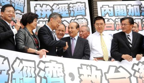Chen was flanked by Legislative Speaker Wang Jin-pyng (王金平) and a group of KMT lawmakers, who together chanted “Boost the economy. Salvage Taiwan. Sean Chen jia you [加油, an expression of encouragement]. Cabinet jia you. Taiwan jia you.”