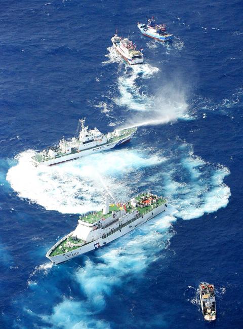 Coast guard vessels from Taiwan and Japan dueled with water cannons yesterday as Taiwanese fishing boats sailed close to the disputed Diaoyutai Islands (釣魚台) to assert Taiwanese sovereignty over the islets.