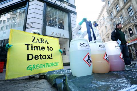 Rose Lai (賴倩如), Greenpeace’s pollution prevention campaign director in Taiwan, said a total of 141 garments were purchased from 29 countries and regions around the world in April, including two items bought from stores in Taiwan — a pair of children’s pants by Zara and a men’s T-shirt by Levi’s.
