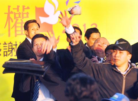 Despite the appeal, the event descended into chaos when Ma addressed the audience, with Alliance of Referendum for Taiwan convener Tsay Ting-kuei (蔡丁貴) shouting: “Ma Ying-jeou doesn’t deserve to be here” and “Give back A-bian’s [former president Chen Shui-bian’s (陳水扁)] human rights.”
