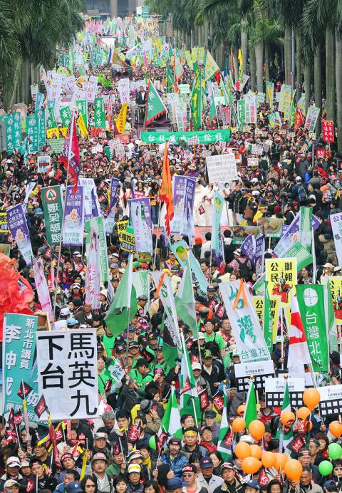 At least 100,000 protesters yesterday gathered in front of the Presidential Office in Taipei and demanded President Ma Ying-jeou (馬英九) step down, in the first mass demonstration since Ma was re-elected in January last year, while the leader of the opposition said he had initiated efforts to recall the president.