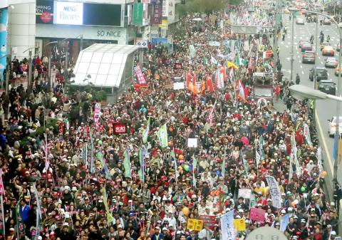 The protest, which the DPP had been working on for nearly a month, came with three demands for the government: a Cabinet reshuffle, a rejection of the controversial Next Media Group (壹傳媒集團) deal and the organization of a national affairs conference.