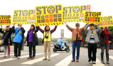 “We urge as many people as possible to join us in our demonstrations not only here in Taipei, but also in Greater Taichung, Greater Kaohsiung and Taitung on March 9, to show the government our determination to put an end to nuclear energy,” Tsuei said.