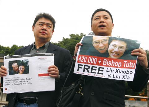 Initiated by Nobel laureate Desmond Tutu in December last year, more than 400,000 people worldwide have signed the petition urging the Chinese government to release Liu immediately, and yesterday was the date set for delivery of the petitions to Chinese diplomatic posts around the world, Wuer Kaixi told a press conference in front of a monument to commemorate victims of the White Terror era on Ketagalan Boulevard in front of the Presidential Office yesterday morning.