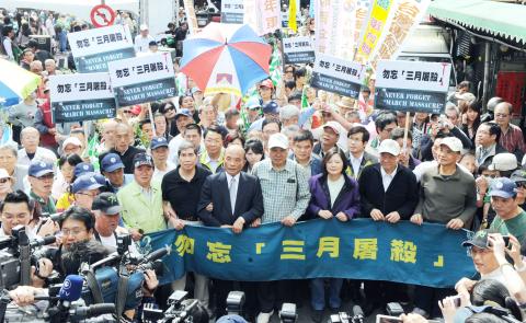 Former DPP chairperson Tsai Ing-wen (蔡英文) called on the public to have the courage to keep moving forward and fight for democracy like their predecessors, who persevered despite having to endure state violence in the 228 Massacre and the ensuing White Terror period during which democracy and freedom were non-existent.