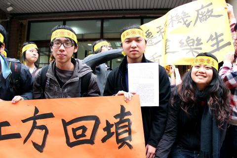 “We came here to see Jiang, because when we went to the Executive Yuan on Feb. 27, he simply ignored us,” Lin Ching (林沁), a National Taiwan University (NTU) student and a member of the alliance, told reporters. “In March last year, the government promised that construction at Losheng Sanatorium — suspended due to landslides — would not resume until they find a way to solve the landslide issue. However, construction resumed last week.”