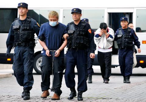 Police said that the two men, surnamed Chu (朱) and Hu (胡), were apprehended and repatriated under the Cross-Strait Agreement on Joint Crime-Fighting and Judicial Mutual Assistance, and arrived at Taiwan Taoyuan International Airport at about 3:30pm under police escort.