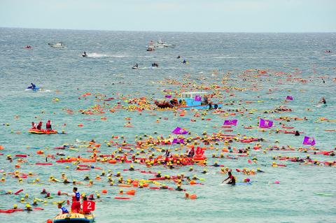 The swimmers were among 4,000 people aged five to 89, including more than 200 from China, trying to swim a 3km distance in the annual “International Olympic Hengchun Open Water Swimming for All” in Kenting’s South Bay (南灣).