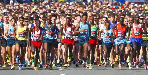 Moments later, the world’s elite runners led off the race. Behind them came thousands of competitors chasing personal goals or raising money for charity, many in fancy dress.