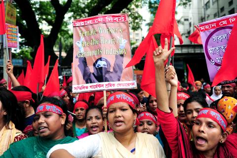 Workers holding red banners and flags chanted: “Hang the killers, hang the factory owners,” as they took to the streets of Dhaka at the start of a series of nationwide demonstrations during the public holiday.