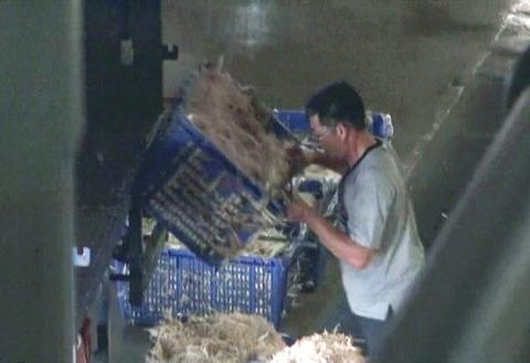 DPP Taipei City Councilor Tung Chung-yen (童仲彥) inspected the market on April 30 and found that workers wore neither gloves nor masks when collecting the feathers of slaughtered ducks. On the fourth floor, dead chickens were found in cages without any protection measures in place, while no sterilization pools were placed in the parking lots to keep dead chickens, as required.