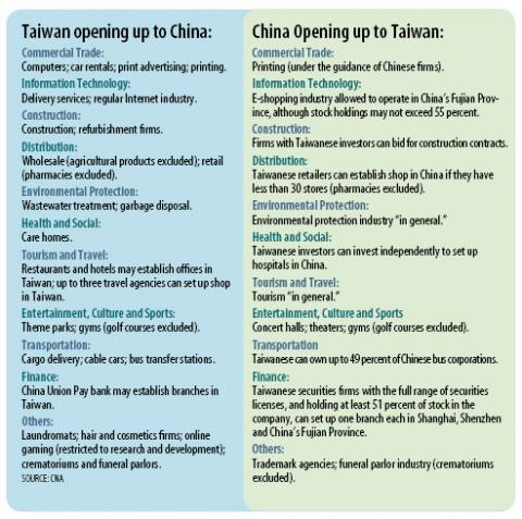 Under the agreement, China would open 80 service sectors to Taiwan, while Taiwan would open 64 sectors to China. The sectors include those related to commerce, telecommunications, construction, distribution, the environment, health, tourism, entertainment, culture, sports, transportation and finance.