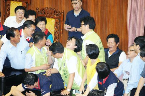 In another round of fighting, DPP Legislator Chen Ting-fei (陳亭妃) was bundled into the back of KMT Legislator Chen Shu-hui (陳淑慧) and pulled out some of the latter’s hair.