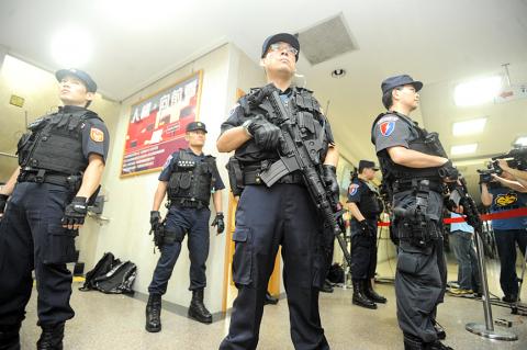 Police handcuffed the 65-year-old as soon as he stepped off an Air China plane yesterday at Taipei International Airport (Songshan airport), where nearly 600 officers, including SWAT team members, had been waiting for several hours.
