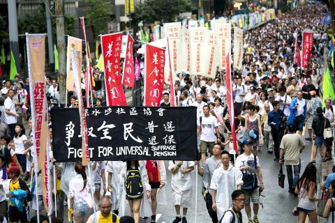 Tens of thousands of protesters, some waving British imperial flags and denouncing Chinese “colonists,” marched through torrential rain in Hong Kong yesterday to clamor for universal suffrage on the 16th anniversary of the territory’s return to Chinese rule.