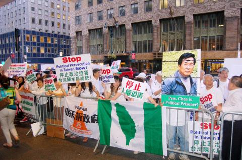 Protest convener Lai Hong-tien (賴宏典), a dentist in the Manhattan area, said he had been unaware of Ma’s visit until Friday, adding that the rally had been hastily organized by a small number of people.