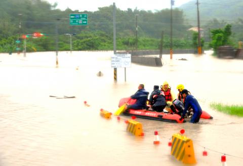 In Yunlin County’s Dounan Township (斗南), rescuers helped 36 senior residents in a nursing home to evacuate. More than 300 people were trapped by the flood in Hong Wa Yao (紅瓦窯) for more than 10 hours before rescuers sent in food and water supplies.