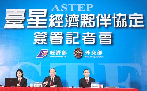 The pact — called the Agreement between Singapore and the Separate Customs Territory of Taiwan, Penghu, Kinmen and Matsu on Economic Partnership (ASTEP) — was signed by Representative to Singapore Fadah Hsieh (謝發達) and Singaporean Trade Representative to Taiwan Calvin Eu at a ceremony held at 9:30am in Singapore.