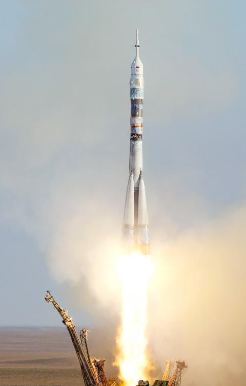 A Russian rocket soared into the cosmos yesterday carrying the Sochi Olympic torch and three astronauts to the International Space Station ahead of the first-ever spacewalk for the symbol of peace.