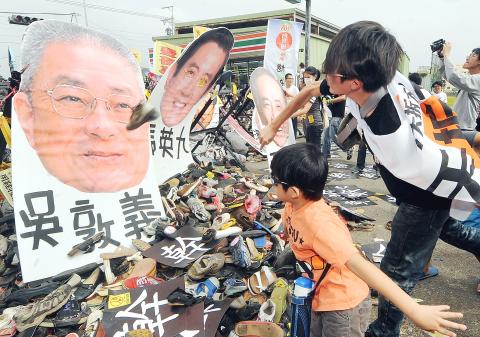“We’ve collected the shoes from Taipei, Taoyuan, Hsinchu, Miaoli, and Greater Taichung, and each pair signifies the public’s discontent with Ma and his government,” TIWA researcher Wuo Young-ie (吳永毅) told the crowd. “Hence, we are throwing the shoes at Ma not only because we’re upset about his performance, we’re doing it also to show him the true public opinion — this is to remind him what 90 percent of the people think of his government at a time when his approval rating is only 9.2 percent.”
