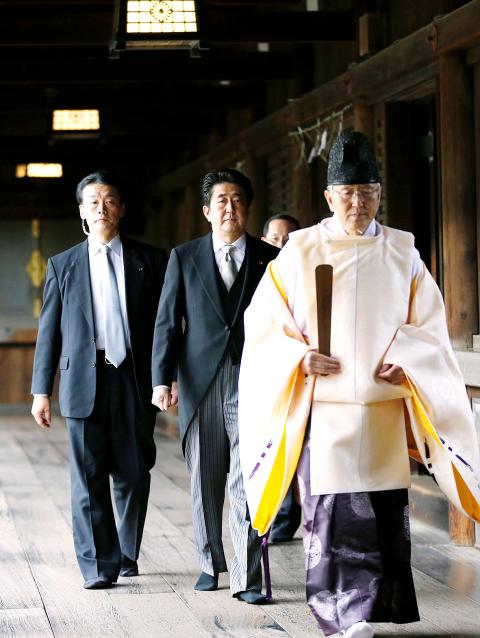 Japanese Prime Minister Shinzo Abe visited a shrine yesterday that is seen by critics as a symbol of Tokyo’s wartime aggression, infuriating China and South Korea, and prompting concern from the US about deteriorating ties between the North Asian neighbors.