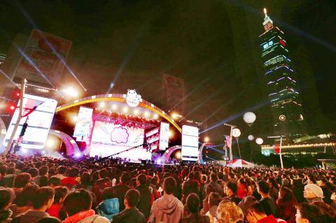 More than 850,000 revelers flocked to the streets around Taipei City Hall last night for the countdown party and the annual Taipei 101 fireworks show, crowding Xinyi District (信義) in the nation’s capital in a festive atmosphere celebrating the arrival of the New Year.