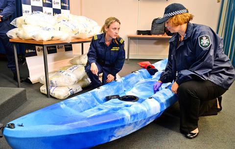 Australian authorities have seized A$180 million (US$162 million) of methamphetamine stashed in a consignment of kayaks from China and arrested four Taiwanese, police said yesterday.