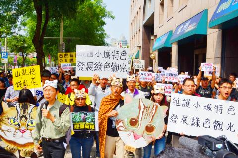 Hundreds of Miaoli residents, led by Sanyi Township (三義鄉) Mayor Hsu Wen-ta (徐文達), arrived at the EPA building to voice their support for the local government’s plan.
