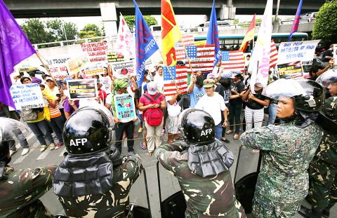 Dozens of leftwing activists protested outside the main army base in Manila, saying the Americans were using China as a bogeyman to gain a forward base in the Philippines.