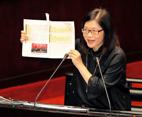 In the legislature in Taipei yesterday, Democratic Progressive Party (DPP) Legislator Kuan Bi-ling (管碧玲) said during a question-and-answer session that the textbook is written from a “extremely pro-China, Japan-hating, anti-independence, DPP-vilifying and KMT-eulogizing” perspective.